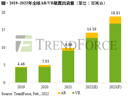 根據TrendForce研究顯示,2022年AR/VR裝置出貨量將上修至1,419萬台,年成長率43.9%,成長動能來自疫情增加遠距互動需求,以及Oculus Quest 2壓價策略,Microsoft HoloLens 2和Oculus Quest 2市占分別在AR、VR居首位。