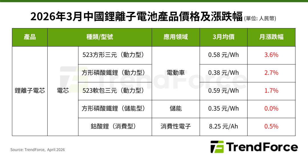 成本上調帶動,預估2Q26動力電芯價格續漲