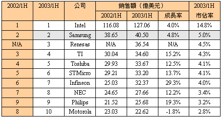 2003年上半年全球前10大晶片製造商排行