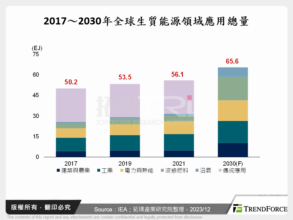 為達成淨零碳排目標,各國致力發展再生能源技術,生質能源即為其中一項。生質能源特色在於其循環特性,經由動植物碳固定後,利用生物質進行轉化為能源,燃燒後不會增加大氣中二氧化碳總量。根據估計,現代化生質能源從2021年25.8EJ將成長至2030年65.6EJ,以倍增速率成長。